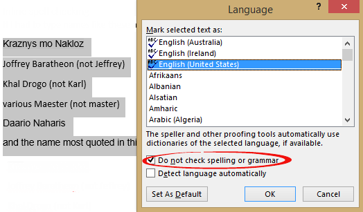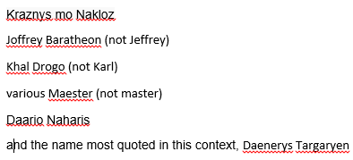 Among Mr Martin’s other complaints about modern word-processors are Automatic capitalization and Inline spell checking, both of which can be disabled in Microsoft Word. It gives us an excuse to talk about turning off those and similar features in Word, plus a special ‘Game of Thrones’ dictionary just for Word:
