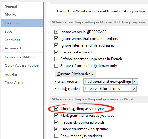 Turning off that option doesn’t stop you using spell checking another way. Either turn ‘Check spelling as you type’ back on or press F7 (Review | Spelling and Grammar) to check the document and display problems in a pane.