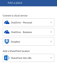 According to Microsoft, the new apps can open, edit and save documents from OneDrive, OneDrive for Business, SharePoint, Dropbox, Google Drive and Box. In fact the locations are strangely split. Under ‘Open | Add a Place’ there are both OneDrive’s, Dropbox and Sharepoint.