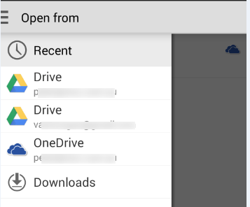 ‘Open | Other cloud storage’ has Google Drive accounts and presumably others depending on what other storage services you have installed.