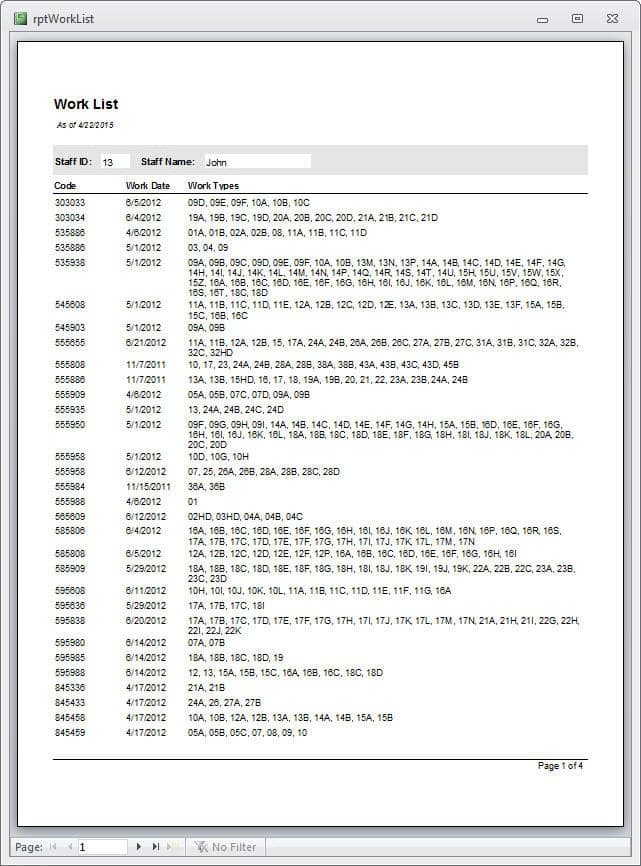 Figure B. The report with concatenated work types per StaffID, Code and WorkDate