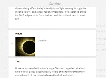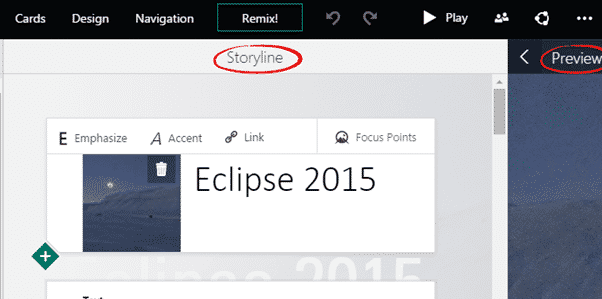 On the other hand, Sway isn’t WYSIWYG. We’ve become accustomed to editing a document as it’ll look in the final product. Sway is a bit ‘retro’ in having a separate editing area (called ‘Storyline’ for no good reason) then you have to switch to a Preview mode.