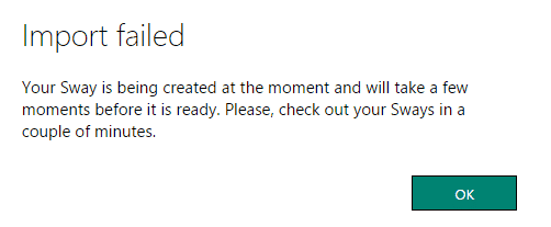 The ‘Import Failed’ message doesn’t make sense. The import didn’t work, but then Microsoft says the Sway is being created? It’s fibbing … no Sway is created for a failed import.