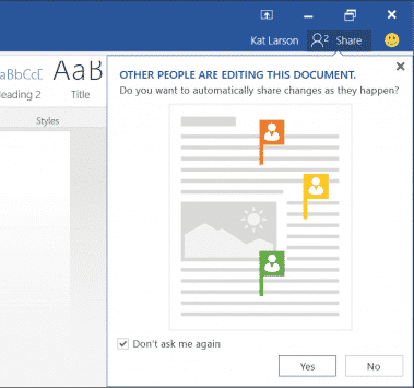 When you first try co-authoring there’s a notification pop-up to make sure you’re aware that the document can be edited by others:
