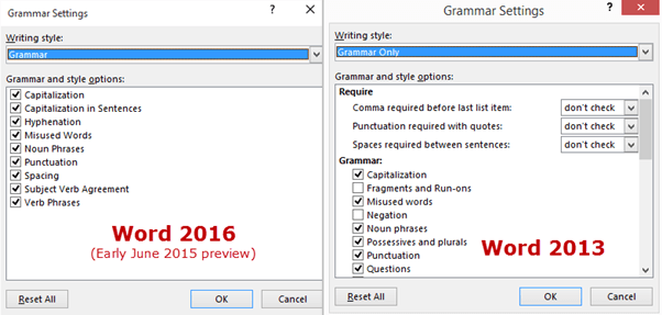 One part of Word and Outlook to watch is the grammar checker because it’s fundamentally changing.   Microsoft is totally rebuilding the grammar checking system.  They are switching to software made by Microsoft and reducing (if not removing) the technology license fees to other companies.  That means there’ll certainly be differences in some blue squiggly lines in Word 2010/2013 and the new system in Word 2016.  At the moment, Word 2016 Preview lacks the Style check available in Word 2013 and many of the options: