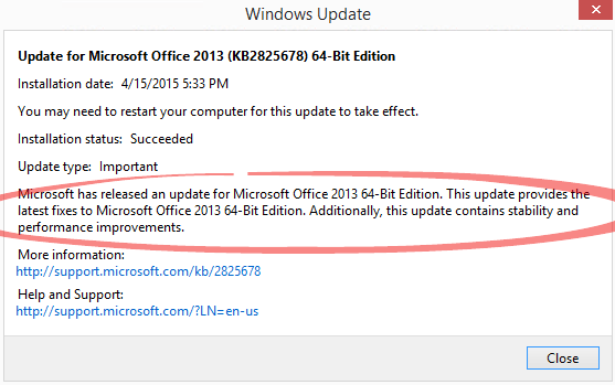 “Microsoft has released an update for Microsoft Office 2013 64-Bit Edition. This update provides the latest fixes to Microsoft Office 2013 nn-Bit-edition. Additionally, this update contains stability and performance improvements.”