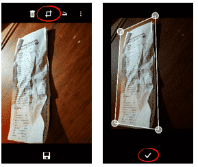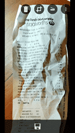 Microsoft demos are one thing, we thought we’d try it ourselves with a crumpled receipt taken at an odd angle. Click on the Crop button and select the relevant part of the image (not necessarily a square or rectangle) then click the ‘tick’ button.