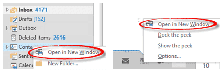 Most Outlook users have more than one window open at any time. They use the right-click on a folder and choose ‘Open in New Window’ open that folder in another window.