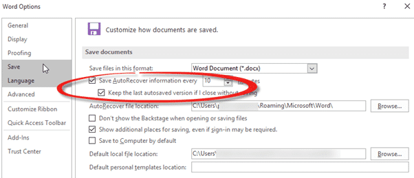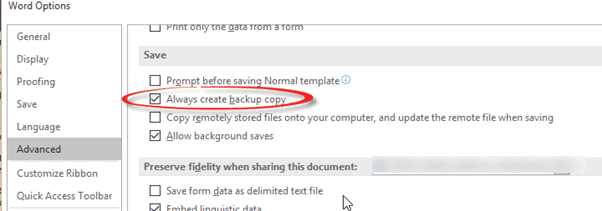 This very handy option saves the document you’re working on and the version prior to the most recent save. The most recent changes aren’t in the backup copy. In other words, if you save Sherlock.docx, Word will also save Sherlock.WBK which is the current document less the most recent changes.