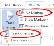 Set to ‘No Markup’ so the document changes don’t clutter up your screen. If you need to recover deleted text or objects, turn on Markup so you can see and restore anything put into the document.
