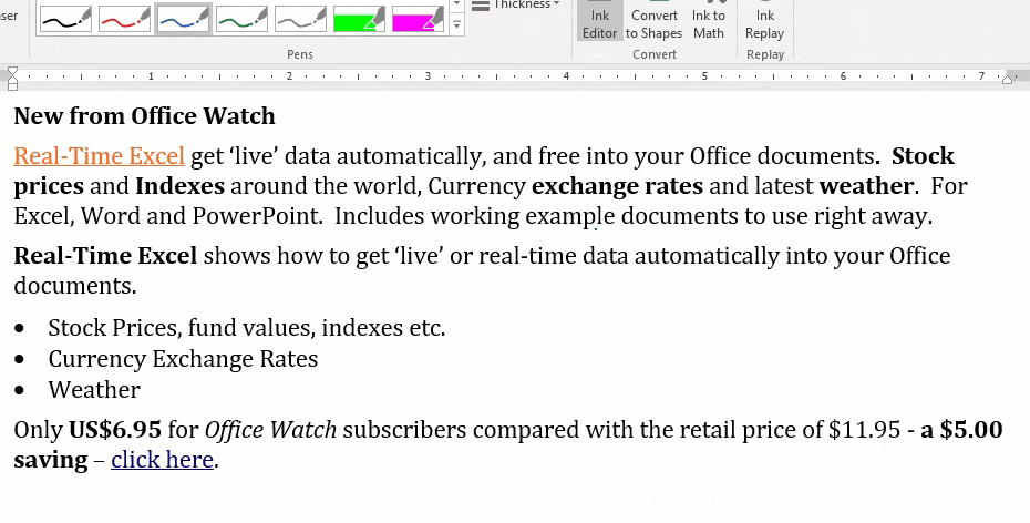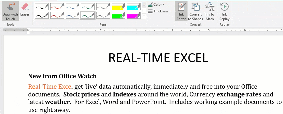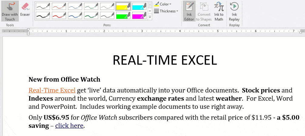 To highlight text, click on Ink Editor then choose one of the highlight options in the gallery. Now ‘draw’ over a line or phrase, the drawing doesn’t have to be precise. Ink Editor will translate your drawn line into standard highlighted text.