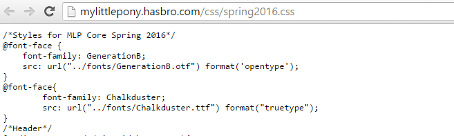 Hasbro has now changed their web code to remove the offending font from http://mylittlepony.hasbro.com/css/spring2016.css but it’s too late since there’s plenty of evidence of the previous CSS that clearly linked to GenerationB.