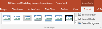 Once you’ve made a Zoom there are more display options on the Zoom Tools | Format tab. There’s an interesting Zoom Background option to make the background transparent so it seems to merge into the overall presentation.