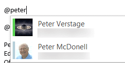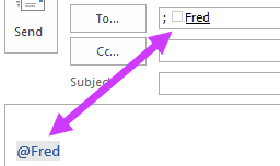 Typing the @ symbol in an Outlook message body lets you insert a contact into the message and the TO field. A list appears as you type, taken from matches in your Contacts list and email autocomplete list.