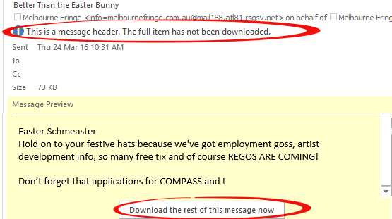 Download immediately by choosing ‘Download the rest of this message now’ from the body of the message.