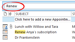 The other two results are also correct. The first has a PDF attachment with the word ‘renew’ buried in the searchable text. The last item has the search term in the notes for the appointment.