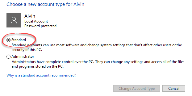 For anyone who doesn’t need full admin access, consider making them a Standard user. Go to Control Panel | User Accounts | Manage another account. Select the user then ‘Change the account type’.