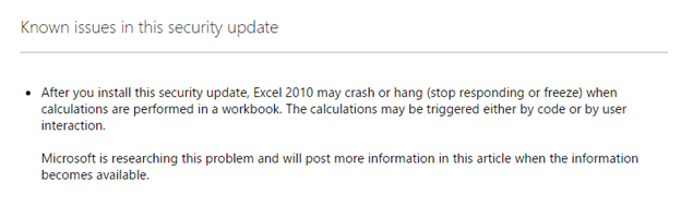A while later the Microsoft Knowledge Base article was updated with a brief and vague ‘Known Issues’ section.