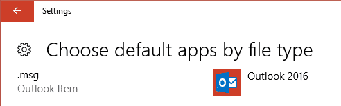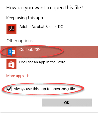 Select Outlook from the list of programs and check the box ‘Always use this app to open .msg files’.