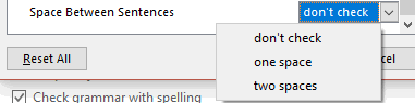 Word defaults NOT checking the number of spaces between sentences. Sentence spacing can get people very excited (we can guarantee getting reader feedback, some of it angry on this topic).