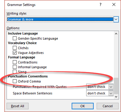 Instead we get a downgraded Oxford Comma check in Word 2016. The only choice is to check for the comma or not. Options | Proofing | Writing Styles | Grammar & more … | Settings
