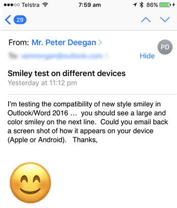 The ‘take away’ is that emoji’s are great but keep in mind that they might not appear in exactly the same way as you do. Compare the emoji sent from Outlook for Windows with the same emoji on iPhone or Android devices.
