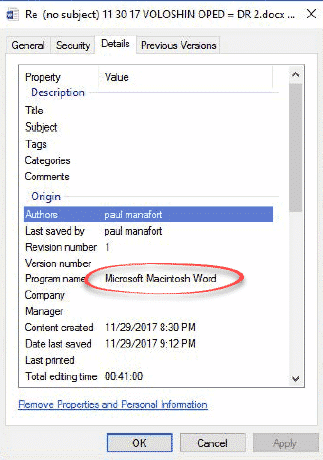 We even know that Mr Manafort uses Office for Mac, when the docx was made, last saved and total editing time.