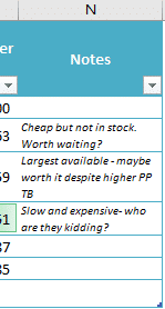 This list shows us the options with some calculations, highlighting the best value (price per Terabyte before and after shipping/tax), two ways to insert comments and more.