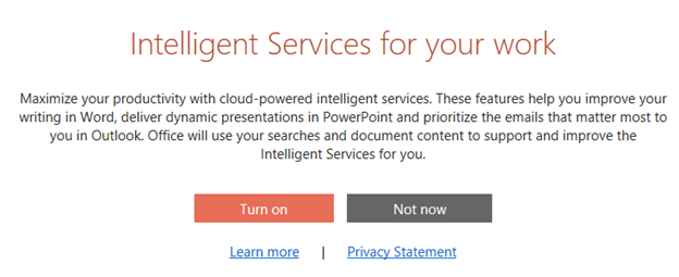 Clicking ‘Turn On’ applies not just to PowerPoint but also Word, Outlook and any other future uses of these cloud services.