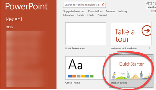 When it’s available to you, QuickStarter will appear on the New pane as ‘Start an outline’.