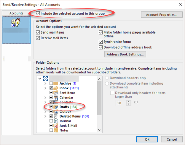Make sure the mail account is included in the group then check the box next to Drafts.