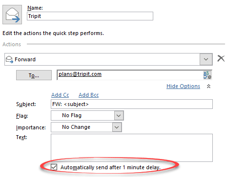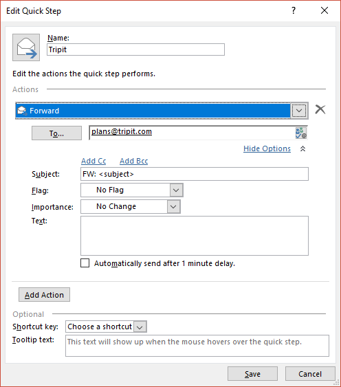 Go back to Manage Quick Steps, choose the Tripit item then Edit.