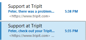 Each time you forward a booking to Tripit, their system responds with a confirmation email or notice of a problem (usually it’s unable to parse the email into an itinerary item).