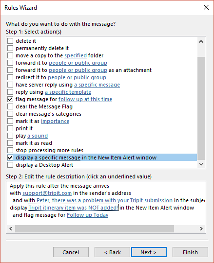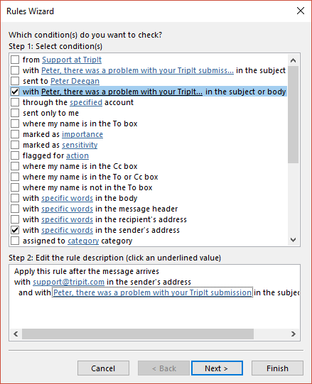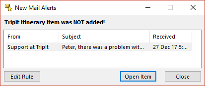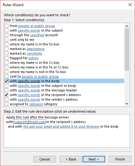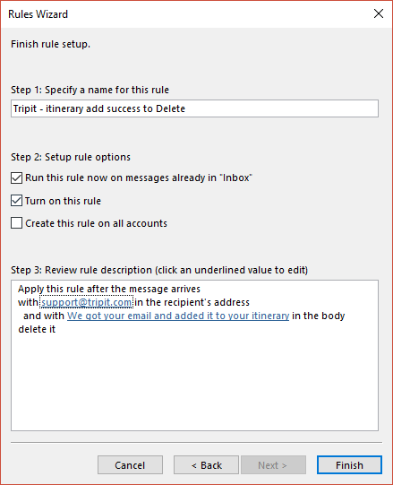 The difficulty is that sending companies can and do change the wording of their emails. We wish that they’d include some tag or phrase that won’t change and rule users can rely on. For example: <Tripit: Itinerary Add SUCCESS>.