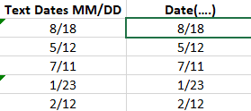 It’s a trap for Excel novices. Typing in a date as plain text seems simple and easy … until you want to do date calculations or comparisons. In Ronny’s case he wanted to find the most recent date from a list of text MM/DD cells. That’s easy if the cells were Excel dates, very difficult as text.