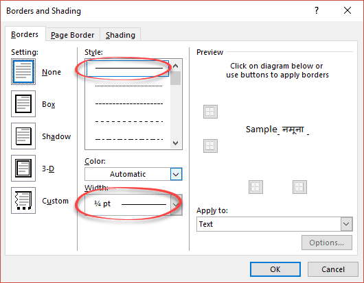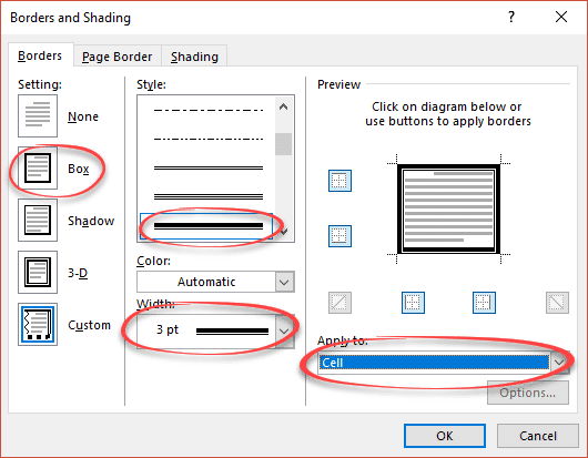 Firstly, remove the default border from the table. Select the table and choose Design | Borders | No Border.