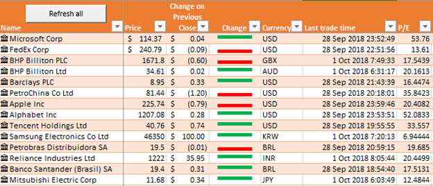 Actual worksheet of global stock with latest prices and other info, included with Real Time Excel