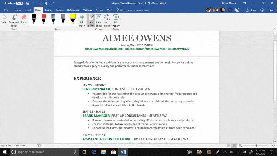 New ink gestures in Microsoft Word–New ink gestures for editing in Word allow you to add handwritten text to a document and interact with existing content using a pen. Now Microsoft 365 subscribers can quickly split paragraphs into multiple lines, insert words into existing sentences, and join separated words, all using natural pen-based gestures. These top requested features make it easier to naturally edit documents and quickly implement changes and suggestions.