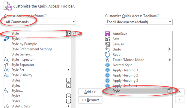 Go to Quick Access Toolbar customization and choose either ‘All Commands’ or ‘Commands not in the ribbon’. Scroll down to the Style section and you’ll find many entries, enough to confuse anyone.