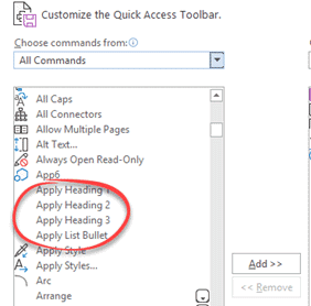 Under ‘All Commands’ or ‘Commands not on the ribbon’ look for Apply Heading 1, Apply Heading 2 and Apply Heading 3 and click add to your QAT.