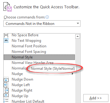 From Commands Not in the ribbon, scroll down to ‘Normal Style (StyleNormal)’