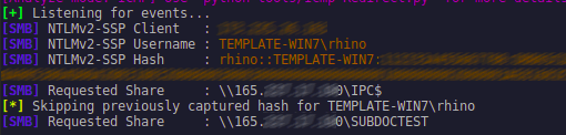 Rhino rigged up a web server that would read Word’s attempt to get the sub-document. That attempt can reveal a networked computers login credentials in clear text or SMB request with NTLMv2 hash