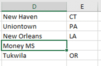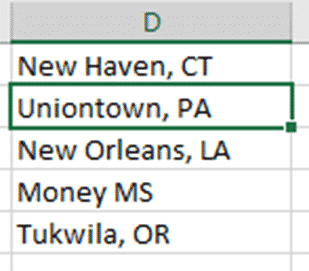 For reasons passing understanding, normal computing practice and plain commonsense, Text to Columns will overwrite the source column! Here’s a very simple column of text that needs splitting into town names and state in different columns.