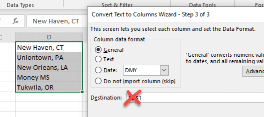 See that Column D has been replaced with the first column of the split text. Ouch. That’s bad if something went wrong, which it did in this example because one of the locations didn’t have a separating comma.