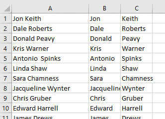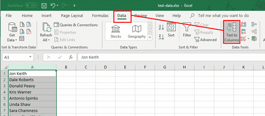This is a good example of splitting two words into separate cells. However, in practice, Flash Fill might be a better choice. Flash Fill can be ‘trained’ to cope with common name variations like middle names or initials, surname prefixes like ‘Van’ etc.