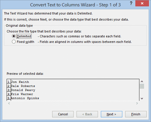 The first page of the Convert Text to Columns Wizard is where you specify what kind of data you are splitting. We have words with spaces between them, so we choose Delimited.