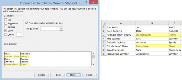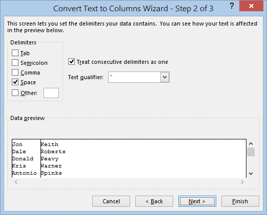 Our data has a space between the words we want to separate, so we tick Space. If you think there may be more than one space anywhere, it is a good idea to also tick “Treat consecutive delimiters as one”. Otherwise the extra space will be treated as another value and you will get a blank cell, with the surname thrown across into a third column.