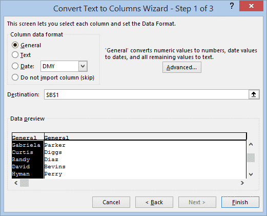 When we’re happy with our settings, click Finish, and our names will be split into two columns.