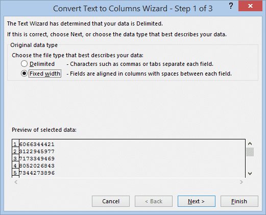 This time, however, as it is always the same number of characters that we want separated, we select the Fixed Width option.