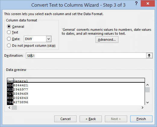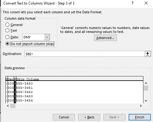 Set the Destination cell of where we want our separated data to start, and click Finish. We now have the numbers split up into area codes and phone numbers.